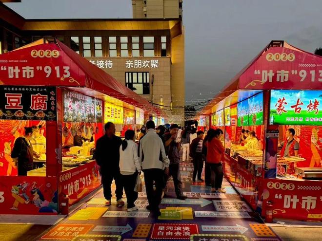 走进“叶市”现场,长达百米的集市长廊人群熙攘,吆喝声、欢笑声此起彼伏,烟火气十足。作为集市的核心吸引力,以各地特色小吃为主打的美食摊位紧密相连,炭火与灯光的交织下,蒙古烤肉串在烤架上翻滚,油脂滋滋滴落,香气扑鼻。特色长沙臭豆腐则在油锅中上下翻腾,外皮焦香,鲜辣开胃。此外,三鲜豆皮、武汉热干面、天津狗不理包子等各色小吃一应俱全,引得食客接踵而至。