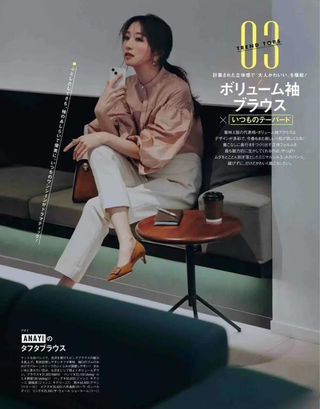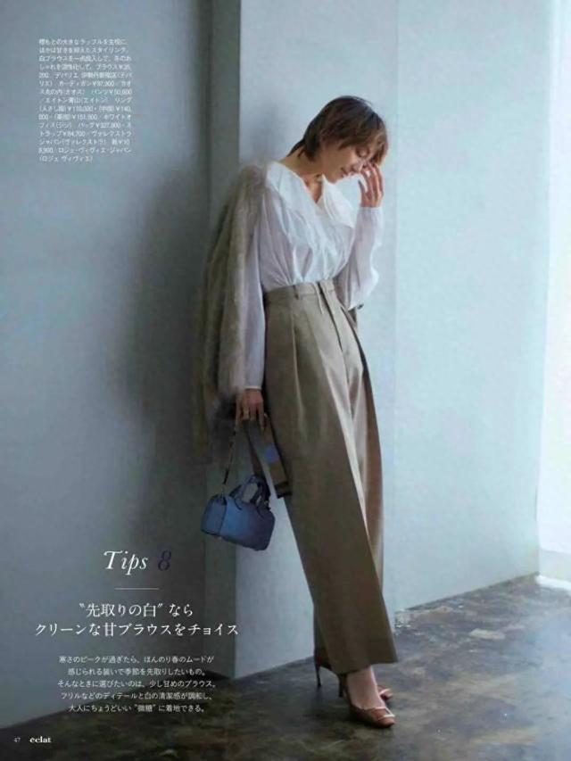 白色镂空衬衫+卡其色九分阔腿裤,裤腿控制在了一定的宽度内避免了蓬松臃肿,将衬衫下摆塞进裤腰露腰腰线,这身打扮小个子身材完全可以照搬,显瘦又显腿长▼