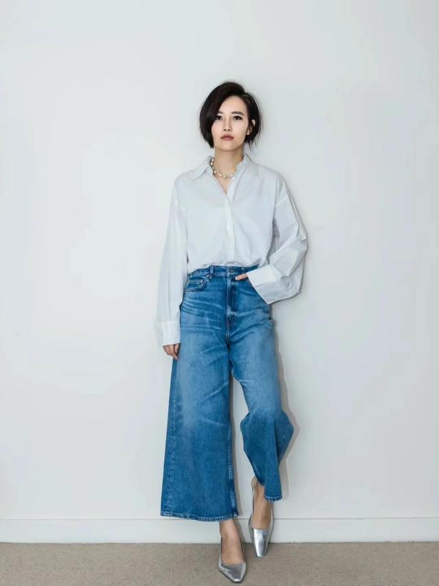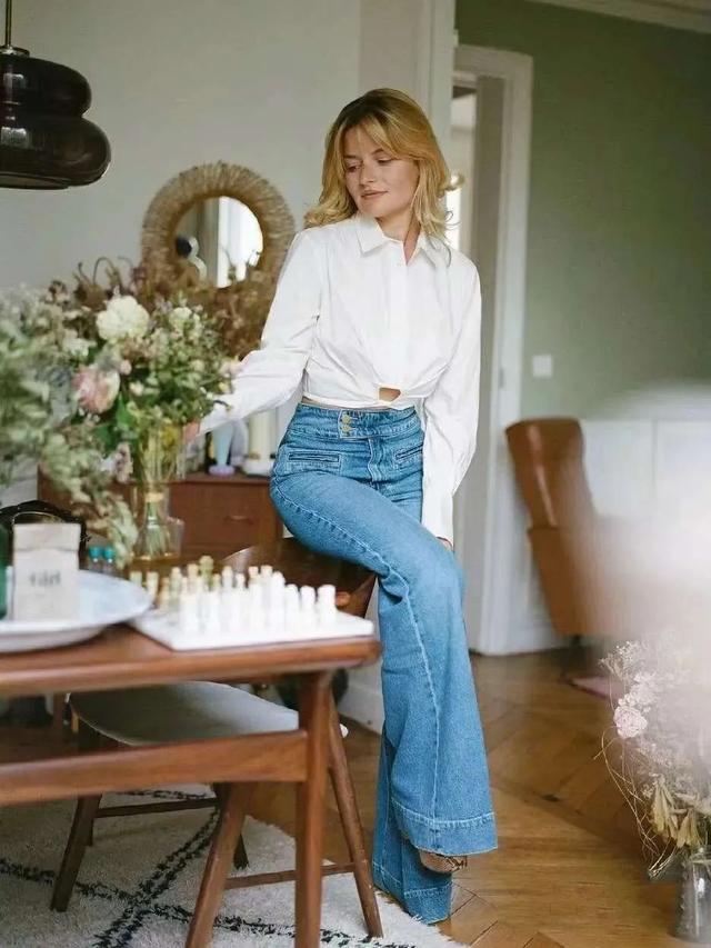 白衬衫+微喇牛仔裤,满屏都是青春美好的气息,微喇裤腿还氤氲出轻复古的氛围,让我们领略到了“复古=高级”的魅力▼