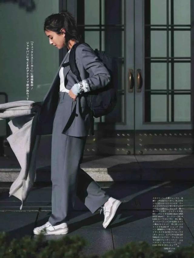 穿一身西装+西裤的灰色套装,然后脚上画风急转直下搭配一双运动鞋,这是很多潮人的穿搭套路,这种混搭的风格既帅气又休闲,一扫通勤氛围的沉闷老气,反而穿出了活泼、运动的时髦效果▼