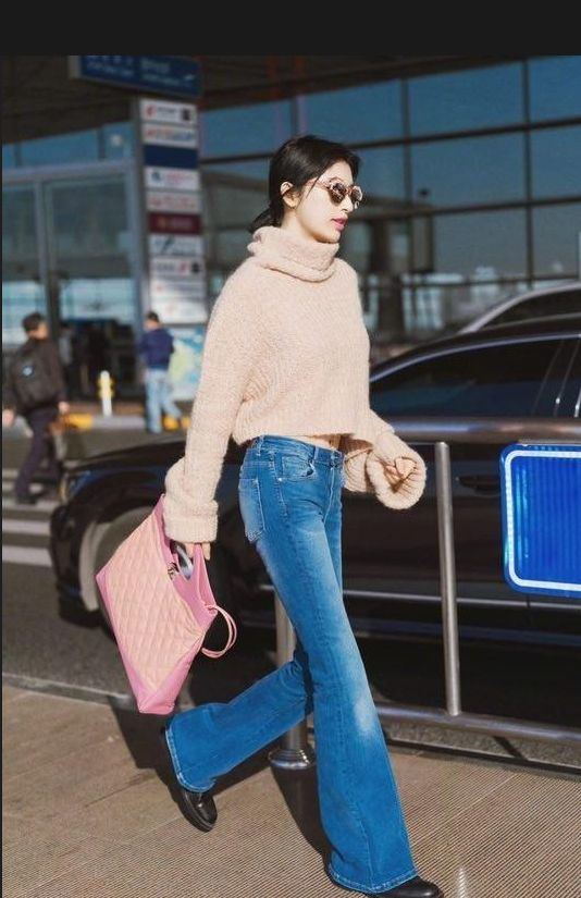 短款毛衣+高腰微喇牛仔裤,婀娜的腰肢和修长的简直让人目不转睛,这样的组合刚好适合北方的早春季节▼